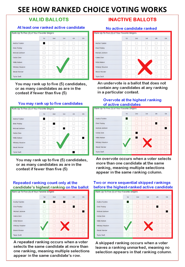 It’s simple: ranked choice voting allows voters to rank candidates in order of preference – first choice, second choice, third choice, and so on. Ranked choice voting lets your vote count toward another candidate if your first-choice candidate does not receive enough votes.